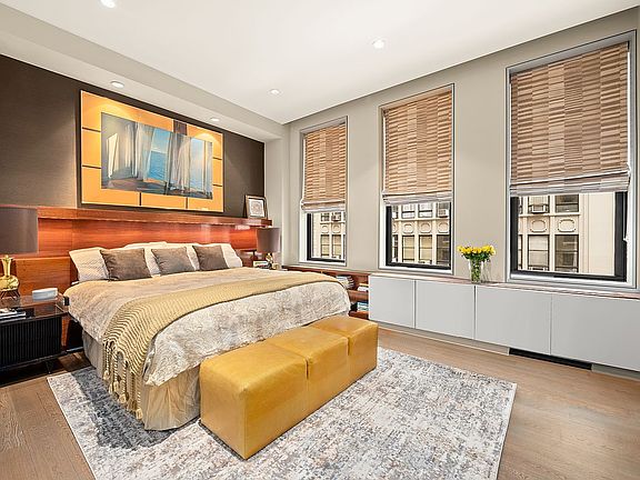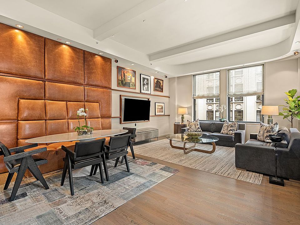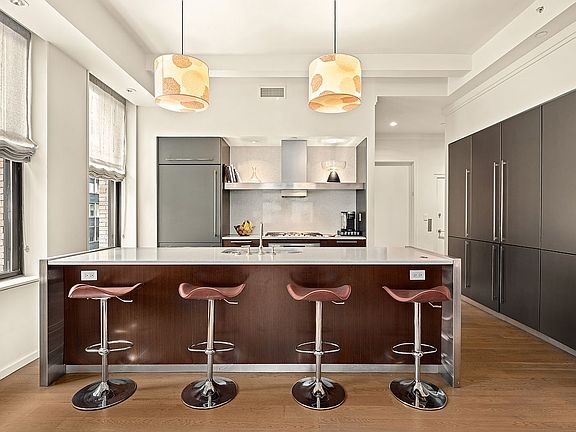 Keyed-elevator access delivers you directly to this nearly 1,800-square-foot showplace featuring wide-plank hardwood floors, soaring 11-foot-tall beamed ceilings and rows of oversized windows facing north and east. Relax and entertain in the spacious living room where unimpeded eastern views provide a bird's-eye view over 28th Street. A leather banquette and padded wall panels create a luxurious dining area, while the open kitchen welcomes casual meals along its wide waterfall island. Chefs will love the custom cabinetry, a wall of pantry space and a fleet of upscale appliances, including a vented Miele cooktop and oven, Sub-Zero refrigerator, dishwasher and wine refrigerator.