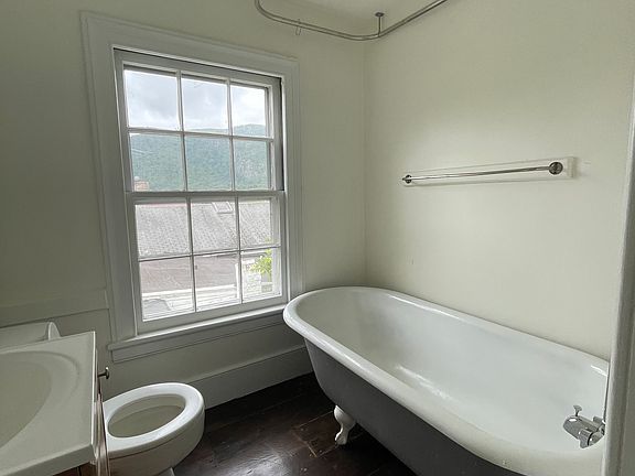 A full bathroom featuring an original clawfoot tub with shower and more breathtaking views over the village rooftops to the Hudson