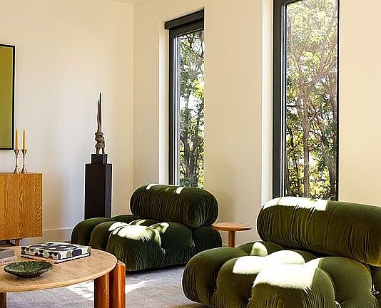 The main level flows into a spacious living and dining area defined by a sequence of oversized windows, welcoming treetop views and natural light throughout the day. A jewel-box powder room, finished in Fireclay’s Hunter Green tile with a marble sink, adds a bold design statement. Expansive sliding glass doors open to a front-facing terrace with a DCS BBQ — an inviting setting for outdoor breakfasts or twilight cocktails along the water.