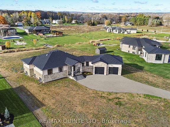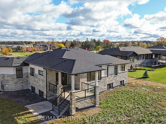This striking executive stone and stucco home offers scenic water views and is located in the desirable "Watermark on the Bay" community in Prince Edward County-just minutes from Belleville and close to trails, parks, vineyards, and the Bay of Quinte. Residents of this elegant enclave enjoy private access to a marsh-front walking trail along the shoreline. Built with energy-efficient Insulated Concrete Form (ICF) construction and a forced air electric heat pump, the home is designed for year-round comfort. Inside, you'll find wide-plank wood flooring, quartz countertops, quality cabinetry, and a striking granite island in the contemporary kitchen. The spacious layout includes a walk-in butler's pantry, a generous mudroom with laundry, and a beautifully appointed 5-piece ensuite. Outdoor living is just as impressive, with a covered front porch and a rear deck featuring glass railings. The bright and open lower level has drywalled walls and is ready for your finishing touch. An oversized attached garage-nearly 1,000 sq. ft.-offers high ceilings, large windows, and ample space for storage or hobbies. With municipal water, Bell Fibe Internet, and a premium location in one of the area's most exclusive neighbourhoods, this home delivers comfort, style, and lasting value.