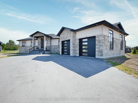 This striking executive stone and stucco home offers scenic water views and is located in the desirable "Watermark on the Bay" community in Prince Edward County, just minutes from Belleville and close to trails, parks, vineyards, and the Bay of Quinte. Residents of this elegant enclave enjoy private access to a marsh-front walking trail along the shoreline. Built with energy-efficient Insulated Concrete Form (ICF) construction and a forced air electric heat pump, the home is designed for year-round comfort. Inside, you'll find wide-plank wood flooring, quartz countertops, quality cabinetry, and a striking granite island in the contemporary kitchen. The spacious layout includes a walk-in butlers pantry, a generous mudroom with laundry, and a beautifully appointed 5-piece ensuite. Outdoor living is just as impressive, with a covered front porch and a rear deck featuring glass railings. The bright and open lower level has drywalled walls and is ready for your finishing touch. An oversized attached garage nearly 1,000 sq. ft. offers high ceilings, large windows, and ample space for storage or hobbies. With municipal water, Bell Fibe Internet, and a premium location in one of the areas most exclusive neighbourhoods, this home delivers comfort, style, and lasting value.