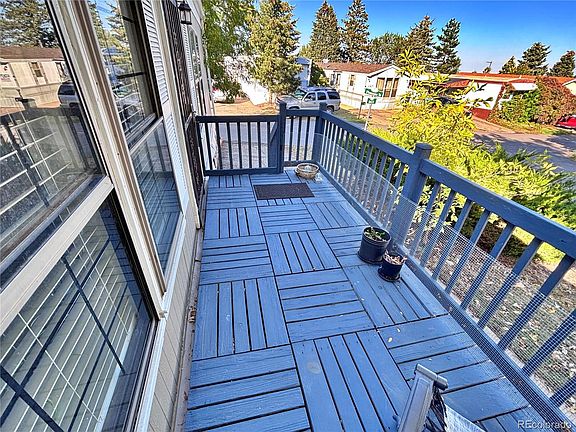 Outdoor living includes a private back garden patio, a welcoming front yard with mature landscaping, and a raised deck with distant views of the Denver skyline. Additional off-street parking for one vehicle adds convenience.