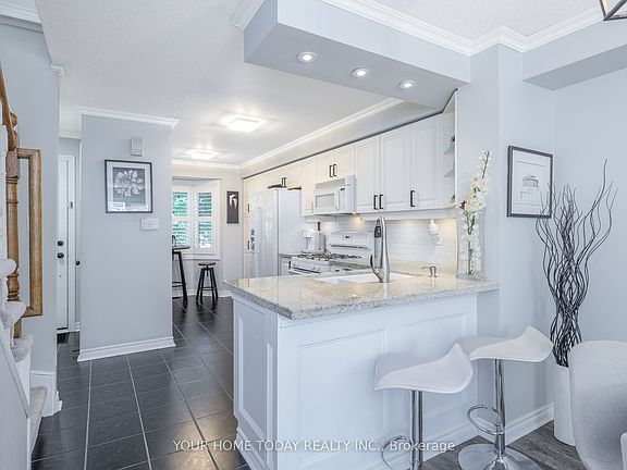 Welcome to this lovely end unit townhouse located in the prestigious Georgetown Estates, an exclusive enclave of executive townhomes nestled amidst mature grounds with the complex backing on to conservation governed land for added privacy. Lovely landscaping and a covered porch welcome you into this spacious 3-bedroom, 4-bathroom home with a walkout from the nicely finished lower level. The main level features a well-designed open concept floor plan with stylish flooring, crown molding, California shutters and tasteful decor. The well-designed kitchen offers neutral white cabinetry, granite counters, breakfast bar, large pantry, subway tile backsplash and breakfast area with bay window overlooking the quiet mature street. The living room overlooks the backyard and is open to a back foyer/entry offering added storage and access to an updated powder room and the deck (perfect for barbequing). A staircase from the deck to the yard is a bonus! The upper level offers 3 good-sized bedrooms, 2 full bathrooms and laundry. The primary suite enjoys a large walk-in closet and luxurious 4-piece with soaker jet tub and glass enclosed shower. The finished lower level adds to the living space with large L shaped rec room boasting hardwood flooring, gas fireplace, pot lights and walkout to the patio and beautifully landscaped fenced yard with no home directly behind! A 2-piece bathroom and storage/utility space complete the package. A private heated in-ground community pool situated in a resort-like setting with an extensive patio area and lovely gardens add to the allure. Close to the charming and scenic village of Glen Williams, Credit River, trails, shops and more. Move in and enjoy sophisticated low-maintenance living in one of Georgetown's most desirable enclaves!