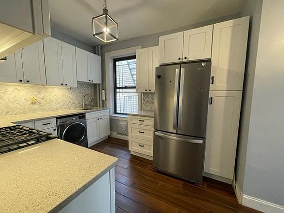 This well-laid-out 2-bed, 1-bath condo is located just a few blocks from Journal Square, offering a quick commute to Manhattan via the nearby PATH station. The renovated kitchen features quartz countertops, a custom tile backsplash, tall white shaker cabinets, and stainless steel appliances, including a gas range, microwave, French door refrigerator, and an in-unit washer/dryer combo. The spacious living room boasts large west-facing windows, high ceilings, wood flooring, and charming moldings. Both bedrooms are well-sized with east and west exposures, bringing in great natural light. The building offers a video doorbell system for added security and is situated on a quiet street yet just minutes to near shopping, dining, nightlife, and PATH station. HOA includes heat, water, and hot water. A great opportunity for those looking to own in a convenient and vibrant neighborhood