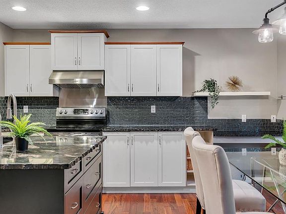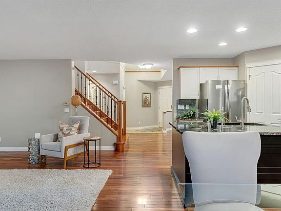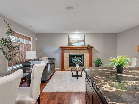 Open House Sat October 25th 1:30-3:30 PM. An Impressive & rare home with 4 beds up and over 3000 sq ft of fully developed space sitting on a huge wide lot, just steps to schools. Welcome to this exceptional home offering a beautifully finished living space, set on a premium lot with lovely mountain views from the front bedroom. Located only a 2 minute walk to the elementary school and under 8 minutes to the middle school, this is a rare find in an ideal family focused location. Step inside to discover a bright and open layout with soaring vaulted ceilings in front foyer, rich Brazilian cherry hardwood floors, upgraded lighting, and a welcoming living area anchored by a soothing gas fireplace. Perfectly positioned windows frame the lush garden views, bringing the outdoors in and filling the space with natural light. The front home office is ideal for remote work, a music room, or a dining/flex space, while the open concept design flows seamlessly into a perfectly placed dining area and a beautifully appointed kitchen. The standout kitchen features upgraded French shaker maple cabinetry, sleek granite countertops with natural stone edge, a large island with extra cabinetry, professional grade appliances, a spacious corner pantry, and plenty of prep and storage space perfect for home cooks and entertainers alike. Completing the main level is a 2 piece powder room and a modern, functional mudroom that includes a newer washer and dryer with customized storage as well as direct access to the oversized insulated double garage. Upstairs, the primary suite is a peaceful retreat with large windows overlooking the rear yard, a walk-in closet, and a functional ensuite with a comfort height vanity, soaker tub, and separate shower. Three additional bedrooms offer generous closet space and share a modern 4-piece bath. A bright bonus/games room provides the perfect spot for family movie or game nights or a quiet reading/homework nook for the kids. The basement has been professionally developed with estate level finishings including 9’ ceilings, plush custom carpet and modern trim. This level features a spacious recreation room with custom built in cabinetry, 6.1 sound system and projector/screen (as is), an additional 5th bedroom or gym space with large closet, a bathroom area ready to be developed, and plenty of storage. Enjoy outdoor living in the sunny backyard oasis, complete with mature landscaping, a large patio perfect for relaxing evenings or weekend entertaining. Additional highlights include upgraded lighting, well-maintained roof shingles, full hardwood stairs, built ins, new interior paint, window coverings, and air conditioning for added peace of mind. This home combines pride of ownership with thoughtful upgrades in a serene, sought-after setting just minutes from Fish Creek Park, athletic fields, an outdoor chilled skating rink with its own Zamboni, shopping, and quick access to the new ring road. Move-in ready & a must see! Call now!
