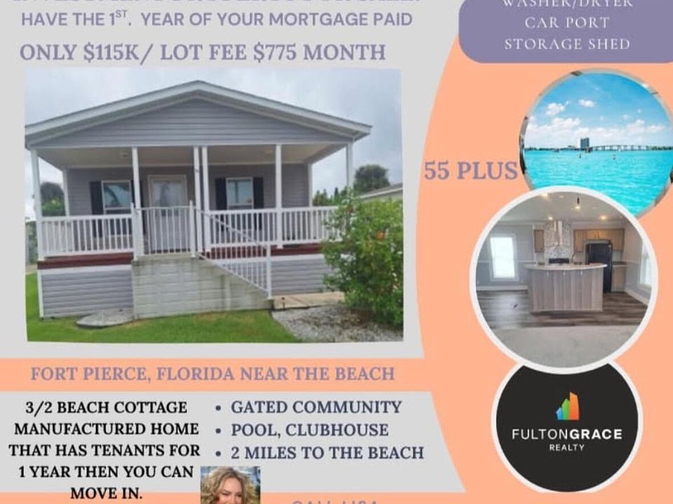 INVESTORS DREAM! TENANTS ARE PAYING ALL THE BILLS FOR NEXT YEAR AND HALF. LOVELY 3/2 BEACH COTTAGE MANUFACTURED HOME! ENJOY THE INDIAN RIVER BREEZES ALL DAY ON THE COVERED PATIO. OPEN KITCHEN/LIVING AND DINING AREA. LOTS OF CLOSET SPACE. FRESH PAINT, NEW APPLIANCES, NEW CARPET. SHED AND CARPORT AND LOTS OF PARKING. GATED COMMUNITY, HEATED POOL YEAR ROUND, CLUBHOUSE, BILLIARDS AND CARD ROOM AND SMALL GYM. NICE SAFE QUIET NEIGHBORHOOD 2 MILES TO THE BEACH AND FUN AT FORT PIERCE MARINA BARS AND RESTAURANTS. $775 LOT FEE INCLUDES TAXES. INVESTOR CAN RENT UNLIMITED.