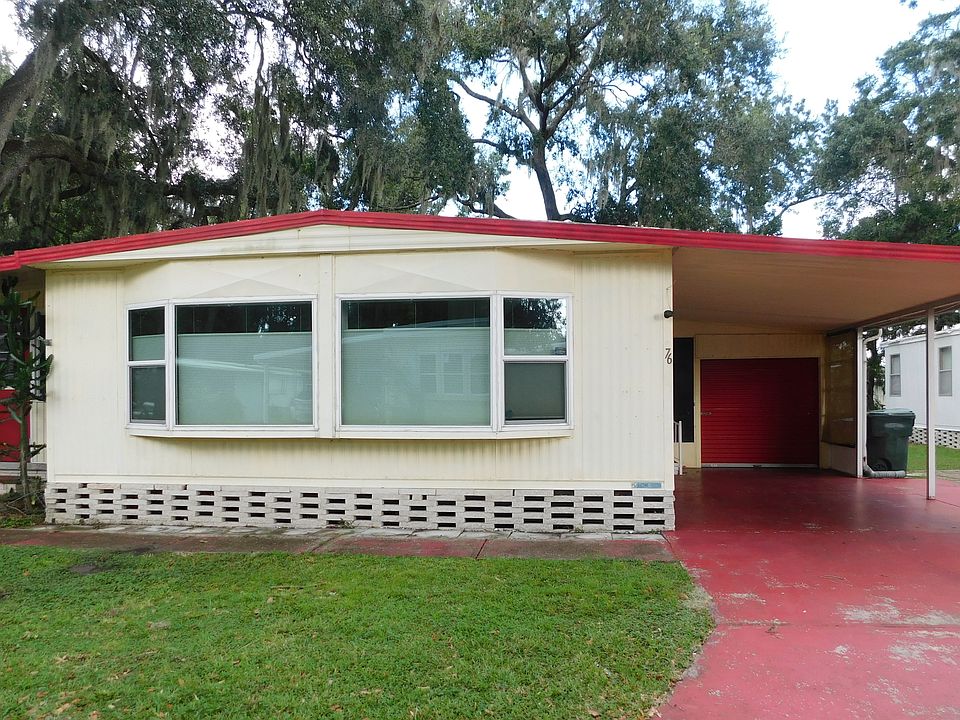 2 Bedroom, 2 Bath Home in great location offers the talented do-it-yourself type(s) a canvas with great bones to create your dream. Home offers 1032 square feet of indoor living space plus accessory spaces including a 10' x 15' enclosed lanai, and a 12' x 20' enclosed garage with roll up door. Within the garage space is an 8' x 10' utility shed with washer and dryer. The space enclosed by the garage door offers the potential for a great workshop, craft room, additional storage, etc. The home interior needs an updated look throughout but boasts strong floors which are 3/4'" plywood. Bedroom floors currently have plywood surfaces but could easily be updated with laminate flooring. Walk through kitchen opens to the dining room on one side and a small flex space on the other which could be purposed for a small breakfast nook or office desk. The dining room offers additional storage with a built-in cabinet featuring upper shelves with glass front doors. The dining room opens into the large 14' x 20' living room space which flows onto the enclosed lanai through double glass sliding doors. Master bedroom is 12' x 14' with walk in closet and ensuite bath with walk in shower. Guest bedroom is 11" x 13' and is located adjacent the main hall bathroom which features a tub shower combo. Home is situated on a beautiful shaded lot which abuts community property and boasts a flowing stream to the rear of the home. This home is priced to sell such that the buyer update the home and maintain an equity situation. Call today to see the home that can make your dreams come true. Woodbrook Estates is an Active, pet-friendly, 55 Adult community- the monthly Fee Package includes: Land-lease and Use of all Amenities for $772. (No Additional Taxes.)