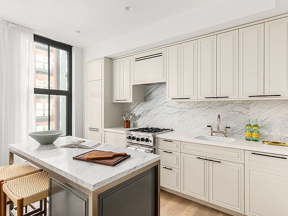Bright South-facing One Bedroom apartment featuring high ceilings, wide-plank oak floors, and oversized windows for great natural light. The open-concept living area and designer kitchen boast custom cabinetry, marble and quartz finishes, and premium appliances.