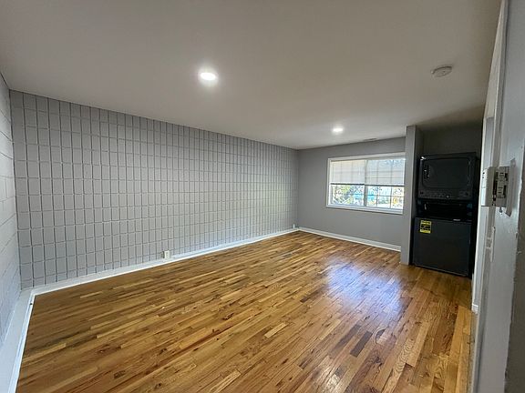 Step inside to find gleaming hardwood floors and a contemporary light-gray paint scheme throughout the main living areas. The spacious living room flows into a fully renovated kitchen with sleek black countertops, modern white cabinetry, and a full suite of stainless steel appliances. Enjoy the convenience of an in-unit stacked washer and dryer.