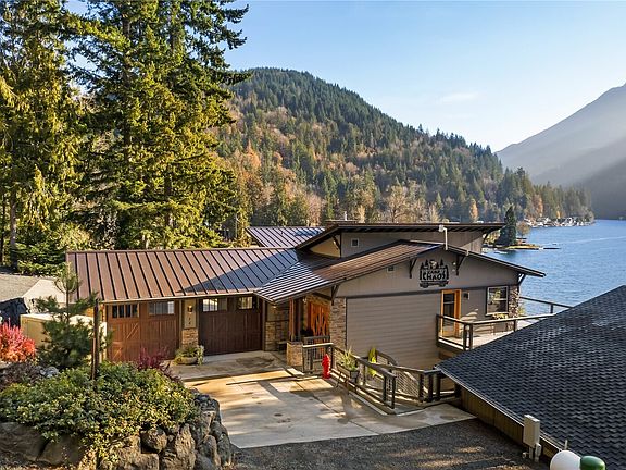 Elegant Estate on Lake Sutherland! 3 Separate Homes-ALL Lake Front! The upper-level on the Main house offers the Primary Suite w/5-Piece Bath, Laundry, 2nd Living Room w/Floor to Ceiling Windows, Office & Walk Around Deck. The lower levels the Heart of the Property offering 8 Seats at the Live Edge Fully Equipped Bar, Dining & Living Room, a Kitchen to please a Professional Chef with Roll Up Garage Door Accessing the Expansive Patio Overlooking the Lakes Edge. 2nd Home-3 beds 2 baths, DADU-1 bed 1 bath. 4 Tax Parcels total, 1 Vacant Acre, A 4,000 sq ft Shop with 7-12'x14' Doors, 2 Full Hookup RV Sites, Playground, 2 Docks w/boat lift, Neighborhood Boat Launch w/No Fees, Steam Room w/shower, NO HOA & Endless 180-degree Lake & Mountain Views!