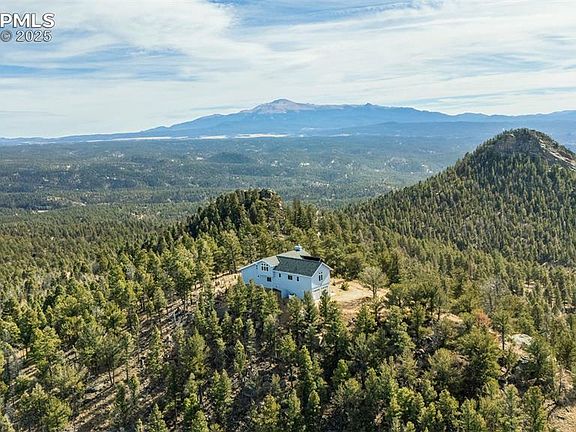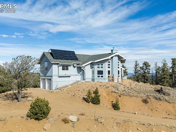 Colorado Living at its best, enjoy the high life at 9400 ft+ elevation, one of the highest points in the area! 360 degrees of spectacular views to include Crystal Peak and Pikes Peak! 14.71 Acres to enjoy the outdoors and 90 minutes from some premier ski resorts. Wood burning fireplace in the Great Room with tremendous natural light from the south facing wall of windows with endless views. The upper master bedroom has a 5-piece en-suite bath, walk in closet, and vaulted ceiling. The other 2 bedrooms are on the main level, with a full and half bath on the main level as well. Upstairs is a large Family room and a space that could be used as an office that overlooks the Great room and has built in bookshelves. Walk out from the main level to the Hot Tub with tremendous views! There is an electric gate at the driveway entry, kind of your own fortress at the top of the mountain. 2 car garage with 8' garage doors. Passive Solar radiant heating and an owned propane tank as well. RV parking with septic hookups. Zoned for Horses. New Roof 3/12/2025, class IV hail impact resistant shingle, save on insurance. Million-dollar views for much less, Come see this beautiful home today!