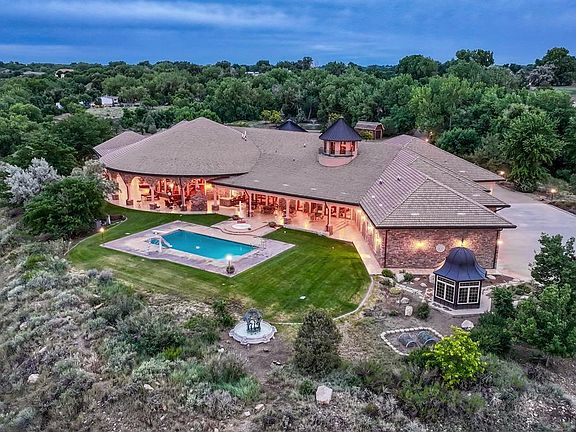 Experience the ultimate year-round retreat on Pueblo's St. Charles Mesa with this gated estate on 10+ acres above the Arkansas River. Enjoy sun-soaked, mild Colorado living, yet just a scenic drive or quick flight from premier ski destinations. The gated entry and sweeping driveway reveal Old-World Tuscan charm. Multiple indoor and outdoor entertaining spaces make hosting effortless, from cozy family evenings to festive holiday celebrations. Inside, cherrywood accents, radiant heated floors, elegant plaster, and marble finishes create a refined, welcoming atmosphere. The main kitchen is a chef's dream with multiple prep areas, high-end appliances, two additional kitchens, and a butler's pantry. A soaring domed ceiling crowns the great room, perfect for holiday magic. For adventure, enjoy a theatre with wet bar and fiber-optic night sky, a billiards/game room, and a spiral staircase to the observatory. The primary suite offers a sitting area, spa-like bath, custom walk-in closet, wet bar, and laundry. Three additional bedrooms, including two junior suites, ensure comfort for family and guests. Outdoors: pool, gazebo, fountain pond, covered terrace with grill and fireplace, plus oversized 5+ car garage and workshop. Just 10 minutes from Pueblo Memorial Airport, this Tuscan-inspired estate combines privacy, adventure, and effortless access, inviting every day to feel like a holiday.