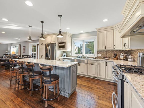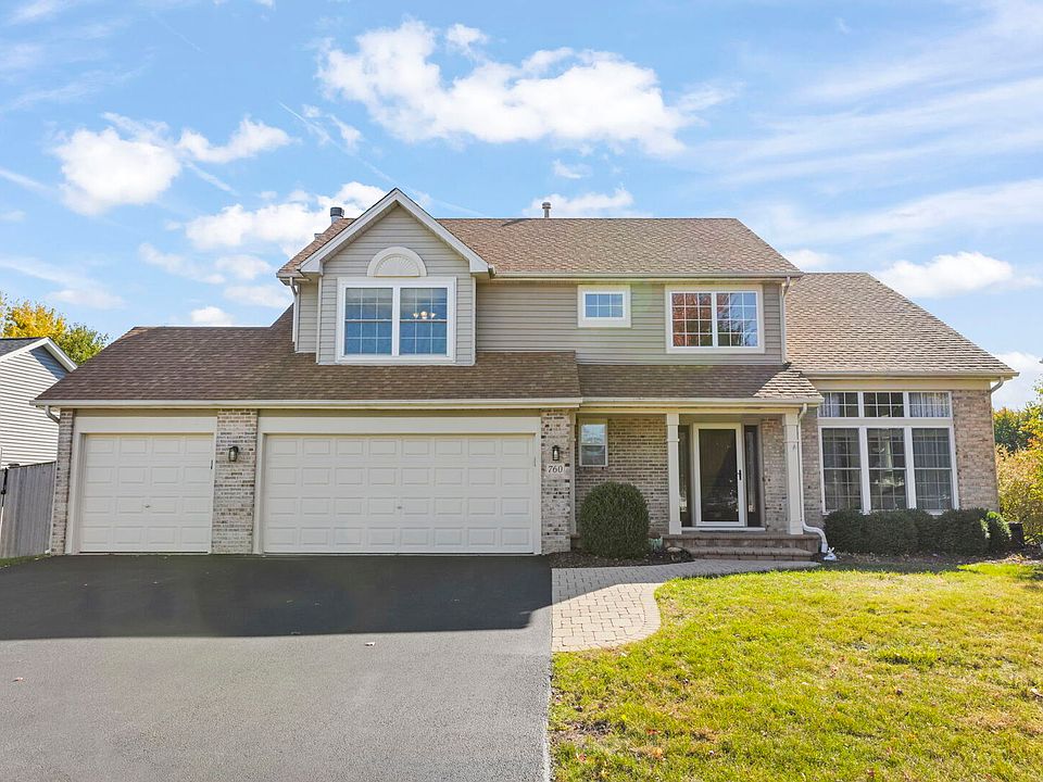 Welcome to 760 Churchill, a beautifully updated home offering 4 bedrooms, 2 full bathrooms, 2 half bathrooms, and a full finished basement. A brick paver walkway and landscaped front yard set a welcoming tone before you even step inside. The two-story foyer showcases a newly refinished staircase detail and engineered hardwood floors that carry throughout the main level. The expanded and remodeled kitchen is the true centerpiece of the home, featuring white cabinetry, a contrasting gray island with seating, quartz countertops, and stainless steel appliances. A spacious eating area with a built-in butler pantry and beverage cooler opens to the family room, where a cozy fireplace creates an inviting atmosphere and large windows provide views of the backyard retreat. The first floor also offers a vaulted formal living room, powder room, and a newly updated laundry room for added convenience. Upstairs, the primary suite serves as a peaceful escape with a walk-in closet, a charming window reading nook, and a stunning private bath complete with an oversized walk-in shower, a copper freestanding soaking tub, new vanity, modern lighting, and stylish tile work. Three additional well-sized bedrooms and a full hall bath complete the second level. The finished basement extends your living space with a dedicated exercise room, a recreation area perfect for movie nights or hosting, an additional half bath, and ample storage. Step outside and enjoy your own backyard oasis, starting with a covered deck that flows to a brick paver patio and a 24' heated pool with surrounding deck - the perfect setup for summer relaxation and entertaining. The yard also features a storage shed and full fencing. The three-car garage provides plenty of room for vehicles, hobbies, or additional storage. Major updates have been thoughtfully taken care of over the years, including roof (2014), main level windows and entry doors (2017), washer/dryer (2019), upstairs windows and driveway (2021), pool, pool heater, bedroom carpet (2022), pool deck, refrigerator, stove, and shed (2023), furnace and A/C (2024) and basement carpet (2025) Located in a desirable Oswego neighborhood close to parks, ponds, shopping, dining, and highly regarded District 308 schools, this home combines comfort, style, and convenience in one exceptional package. Welcome home!!!