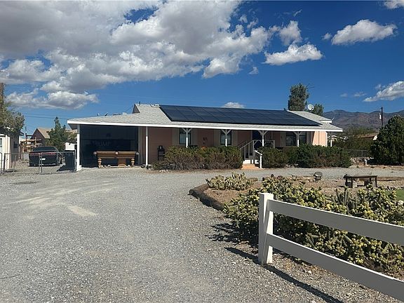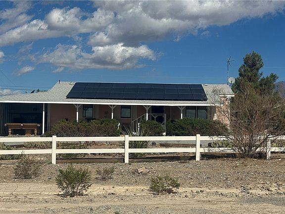 Enjoy peaceful living and stunning mountain views from this charming 1992 manufactured home offering 1,034 sq ft of comfortable living space with 2 bedrooms and 2 bathrooms, plus an additional 240 sq ft bunkhouse—perfect for guests, hobbies, or a home office. This property combines rural tranquility with convenience, featuring municipal water, a private septic system, and no requirement for flood insurance. The home is oriented to take in the natural beauty surrounding it, making every sunset feel like a desert retreat. Solar panels will be fully paid off at close of escrow, providing future energy savings.