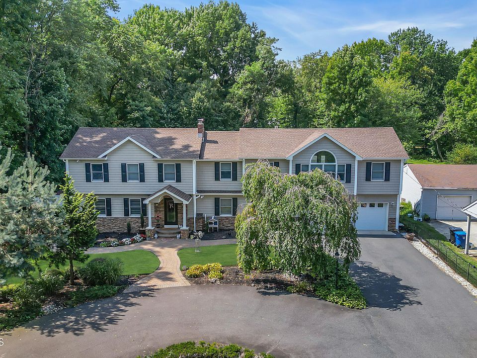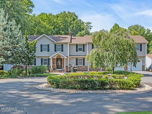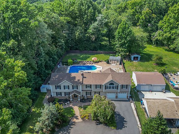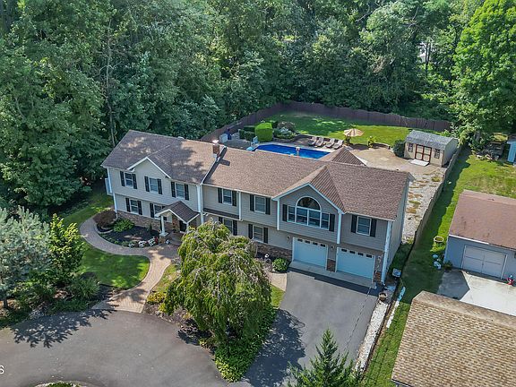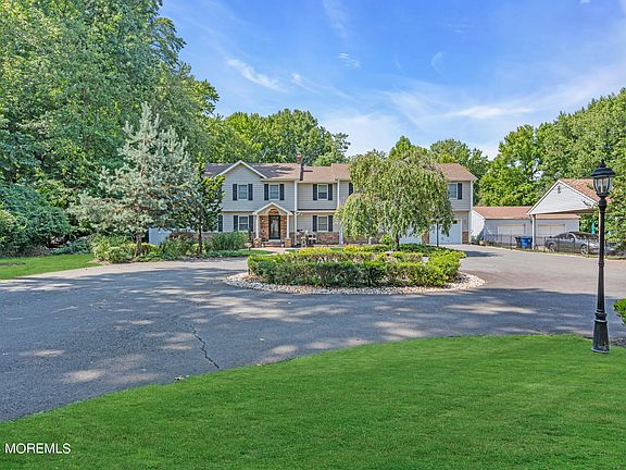 Expanded Custom Colonial features 5 bedrooms & 2.5 baths, nestled on a large lot with a circular drive. The dining room boasts hardwood floors, crown molding and shadow box trim. The kitchen is equipped with a granite island, extensive counters ideal for family gatherings, a newer refrigerator, and stainless-steel appliances. The family room features a brick facade with a floating shelf, gas fireplace, hardwood floors, and a slider. The lower BR with pocket doors could be game rm. Upstairs Bedrooms have hardwood floors and ceiling fans. The master suite is stunning with a cathedral ceiling, chandelier, custom walk-in closet, two additional rooms for a nursery and office, plus French doors open to a balcony overlooking a private resort-like backyard with an in-ground pool.
