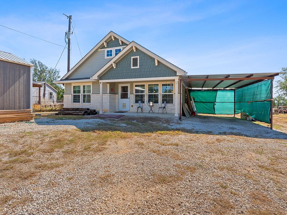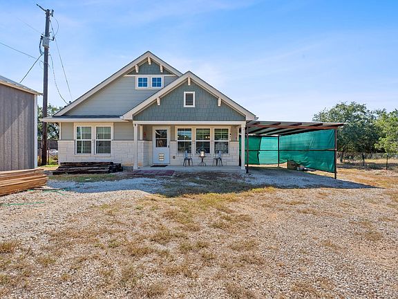 Easy Hill Country living! Bright single-story with vaulted ceilings, open living/dining, and tile flooring. The kitchen features granite-like patterned counters, stainless appliances, rich wood cabinetry, and an island breakfast bar. Split primary suite with tray ceiling, single sink, and a walk-in closet; generous secondary bedrooms plus a dedicated laundry room. Outside: gated entry, wide gravel drive, covered RV/boat parking, two storage sheds, and a back patio that the seller will complete prior to closing. Convenient Spring Branch location near US-281, Canyon Lake, and the Guadalupe River. Move in ready!