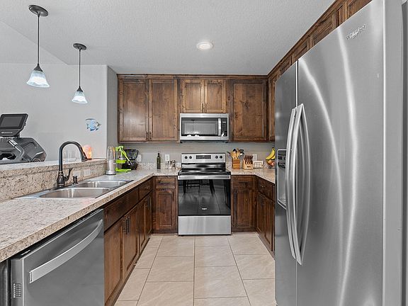 Back patioTwo storage shedsTile flooringStainless appliancesGranite-like patterned countersWide gravel driveTray ceiling