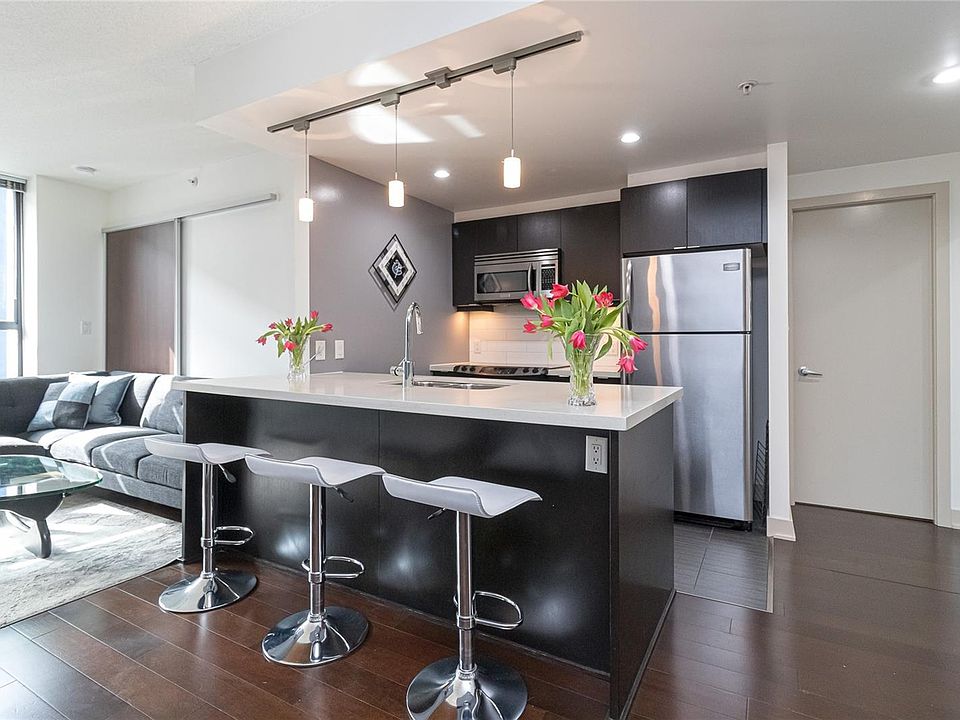 Downtown Living! This beautiful, PET-FRIENDLY, affordable 1 bedroom, 1 bathroom condo may be just what you're looking for! Spacious at 647 fin sq ft, this bright, south-facing unit has expansive windows and an open concept layout. The kitchen has a contemporary look with its fresh white countertops and Frigidaire stainless steel appliances. The generous bedroom with large closet leads into the modern cheater ensuite. An in-suite washer/dryer completes the interior. A storage unit is handily located on the same floor, and downstairs a secure bike storage room is available. This suite comes with an increasingly rare amenity—an underground PARKING SPACE! The rooftop terrace with its 2 BBQs and seating, and its stunning 360 views, is the showpiece of the Juliet building. With this amazingly convenient location you can walk in minutes to cafes, restaurants, shops, gyms, the YMCA, Save-on-Foods, Odeon, Atrium, Royal Theatre and more. Don’t wait to view it!
