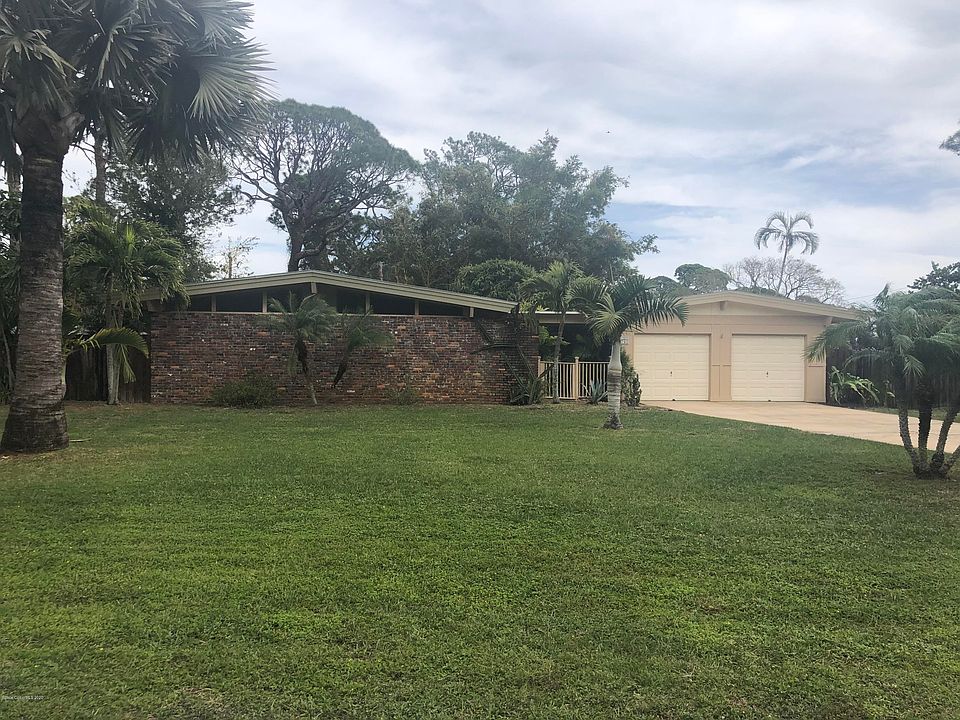 Unique mid-century 3/2/2 home with tons of character and charm on large half acre tropical corner lot in desirable subdivision. Clean,Light and bright with sliders galore, this home opens up into a breezy oasis. A Tropical atrium separates the living area and brick vented oversized 2 car garage. Separate laundry room and (must see) Office/bonus room. Updated bathrooms with beautiful slate tiles. Clean and beautiful terrazzo and slate flooring. Master has gorgeous views of the tropical yard.Plenty of room to build a pool, store your boat AND your RV!!! Priced to sell!