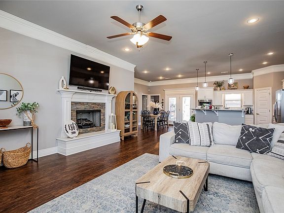 This LIKE NEW home built in 2019 features 4 bedrooms and 2 bathrooms all on one level! Location boasts conveniences to schools, shopping, eateries, parks, and neighborhood access to the bike trails! Enjoy the upcoming cool weather mornings from the comfort of the covered front porch. Head inside to an open concept living room featuring wood-look flooring, extensive crown molding, and gas log fireplace with stone detailing. Flow into the kitchen with a walk-in pantry; s/s gas cooktop, built-in oven and microwave; and island with sink and room for additional seating. Ample dining space with double doors leading to the backyard. Relax and rejuvenate in the primary bedroom with private ensuite: dual sink vanity, jacuzzi tub, walk-in shower with floor-to-ceiling tile and two walk-in closets. Enjoy 3 more bedrooms and additional full bath. Step outside to your fully fenced, meticulously maintained backyard, complete with expanded covered patio and fruit trees.
