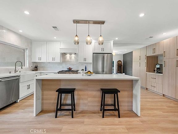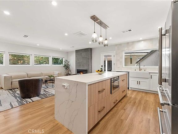 The main home has been beautifully updated with an open floor plan, featuring sleek laminate flooring, a fresh color palette, modern light fixtures, and a large living room complete with a floor-to-ceiling fireplace. The open concept gourmet kitchen is a chef’s dream, equipped with stainless-steel appliances, quartz countertops, white shaker cabinets, a Forno gas range, center island, and a dining area.