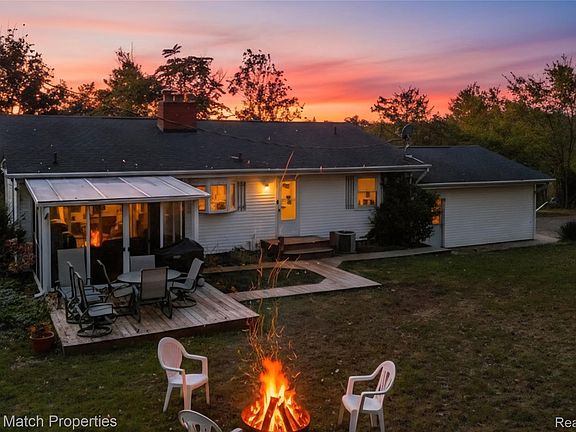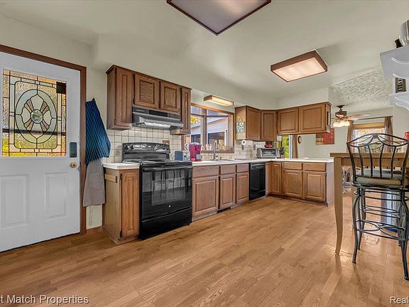 Step inside and you’ll immediately notice the home’s solid construction and timeless charm. The main level features an open and airy living room with a cozy wood-burning stove—perfect for those chilly Michigan nights—a spacious dining area for gatherings, and a well-appointed kitchen with generous cabinet space. Hardwood floors run throughout the upper level, adding warmth and character.
