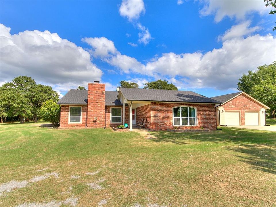 Beautiful one-level home situated on almost 10 acres with endless possibilities. The home was moved to the site in 2005 with full construction completed in 2006—everything was redone at that time. A brand-new roof was installed in 2025 providing potential savings on insurance. This property is all-electric with no gas bill. The home is on well water+ water softener and a septic system meaning no water bill. Entry is secured with a wrought iron electric gate and remote access. Inside you’ll find two spacious living areas including a cozy stone fireplace. The kitchen features granite countertops, stainless steel stove and vent hood, a stylish backsplash, sliding patio door off the dining room leading to an open patio with extended concrete, and a built-in pantry. The large utility room offers abundant storage and a sink.The primary suite includes a spacious bedroom, walk-in shower, and additional storage throughout the home.The detached garage is over 800 sq ft with two garage doors and space for 3+ cars.Outside enjoy a covered front porch perfect for watching sunsets, An open patio off the dining room, park-like yard with mature trees, and wooded acreage that provides privacy and a peaceful setting.The nearly 10 acres offer room to expand, build additional homes, and potentially subdivide. Whether you’re looking for a private retreat or an investment opportunity this property combines the best of country living with modern convenience. No HOA or protective covenants.. Seller is willing to divide and sell the house with 5 acres.