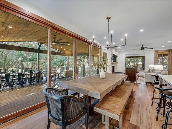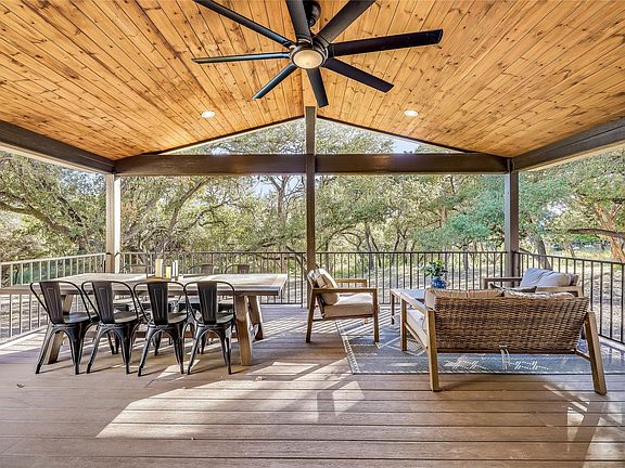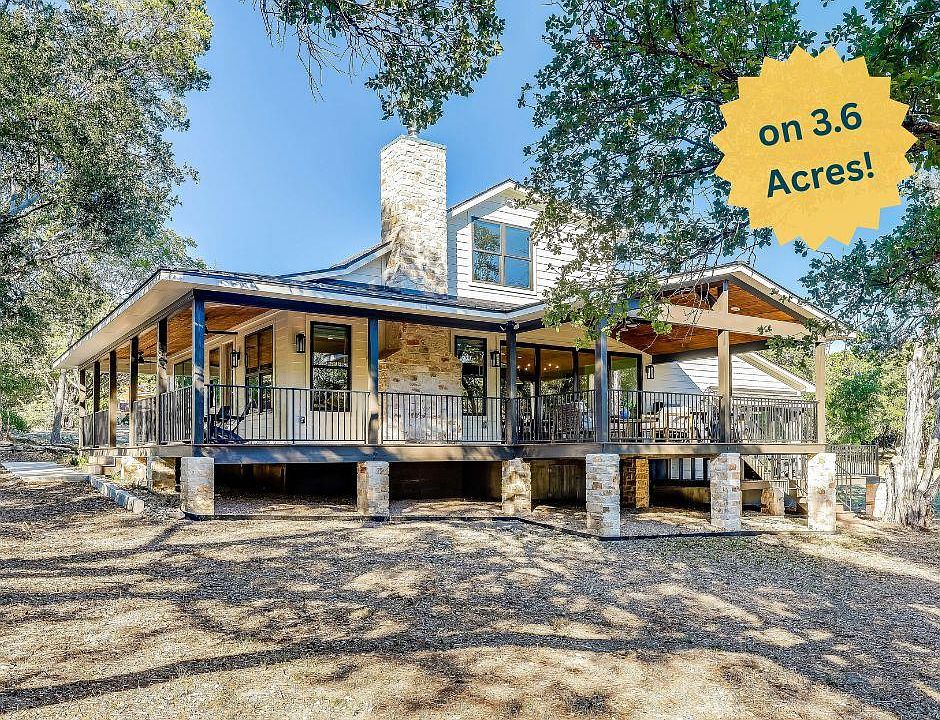Embrace the rustic charm and natural beauty of this exquisite farmhouse style retreat, fully renovated in 2023 with over $600K invested in the renovation! A horse lover's dream- according to city records this is the only property in the city of Lago Vista that allows horses (buyer to verify). The 3.6 acres is enveloped in a canopy of mature trees, with a wet weather creek situated on the back side of the property. A spacious wrap around porch summons friends and family to relax and relish in the natural surroundings. Upon entering, enjoy the open concept floor plan, allowing for ease of entertainment and a cohesive gathering space. Each of the 4 bedrooms includes its own private bath. The primary bedroom is located on the main level, leading into an alluring en suite with a shower and soaking tub combination. A second bedroom is conveniently located on the main level, as well. The thoughtfully designed kitchen, with a generous island, opens directly into the dining area boasting of views of the outdoor surroundings. A wall of glass sliders allows for natural light to flood the home, and leads directly onto the enormous covered porch for added indoor/outdoor enjoyment. The beautiful detail of the custom wood ceiling on the covered porch elevates the design. Just off of the dining room is a sunroom bidding you to enjoy your morning coffee with stunning views outside another wall of sliding glass doors! Around every corner, the custom elements and attention to design details draw you into distinctive, endearing spaces! Upstairs are 2 addtional bedrooms and attached bathrooms. STR's are allowed on this property. Owning this home includes membership to the Lago Vista Property Owner's Association, allowing exclusive access to 9 private waterfront parks, basketball court, boat ramps, campground, disc golf course, fishing well, fitness center, hiking trail, marinas, parks, pavilions, pool, athletic field, tennis courts, pickle ball courts, playgrounds and more!