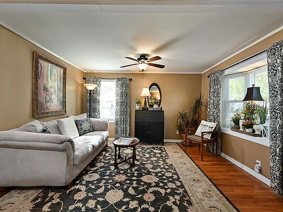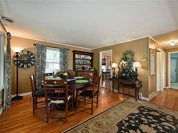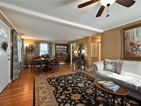 The home opens to a formal living and dining area with large windows and warm wood tones that flow into an eat-in kitchen featuring painted cabinetry, solid-surface counters, and space for casual meals by the front window.