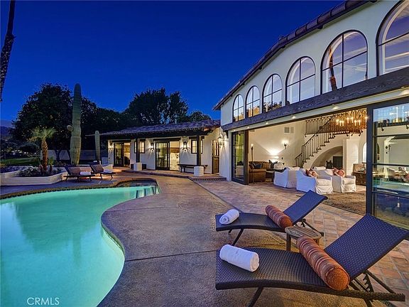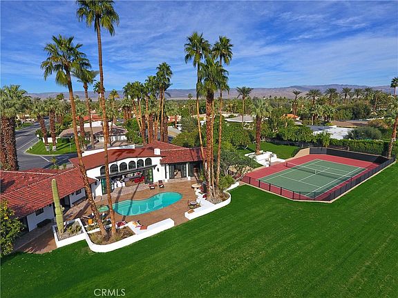 This fully furnished Spanish Revival estate, recently renovated, sits on two private acres in the heart of Indian Wells, offering a serene retreat with breathtaking mountain views. Designed with impeccable craftsmanship, the home features four en suite bedrooms, an open loft lounge that doubles as a bedroom, five full baths, and a guest powder room. The expansive living and dining areas seamlessly flow into a gourmet kitchen, complete with a walk-in pantry and ice makers a chef's dream. Each fully furnished bedroom suite showcases reclaimed wood flooring, custom hand-painted tile bathrooms, and sheer and blackout curtains for ultimate comfort. The outdoor oasis includes a private tennis and pickleball court, a resort-style pool and spa, and lush fruit orchards with a treehouse. A Sonos music system enhances both indoor and outdoor spaces, while entertainment options like basketball, bocce, croquet, ping pong, and foosball ensure endless enjoyment. The one-acre backyard barranca offers a private stretch of grass, perfect for leisure or recreation. Ideally located just 2.5 miles from the Indian Wells Tennis Garden, 8 miles from Coachella, and a short drive to El Paseo's luxury shopping and dining, this fully furnished estate is a rare blend of privacy, elegance, and resort-style living.