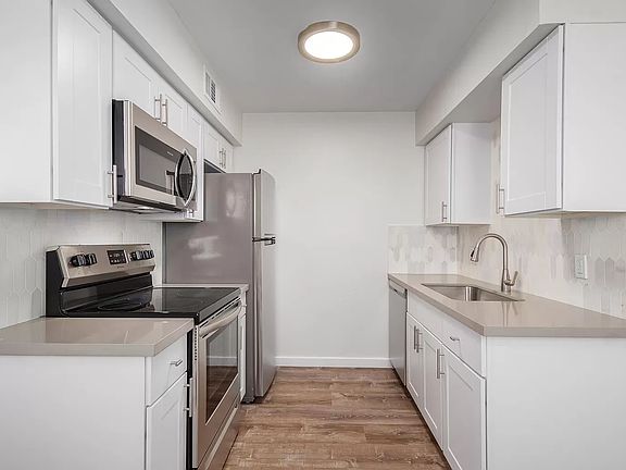 White cabinetsGorgeous tile backsplashesGray sparkling quartz countersStainless appliancesWasher and dryerComplimentary wood-styled flooring