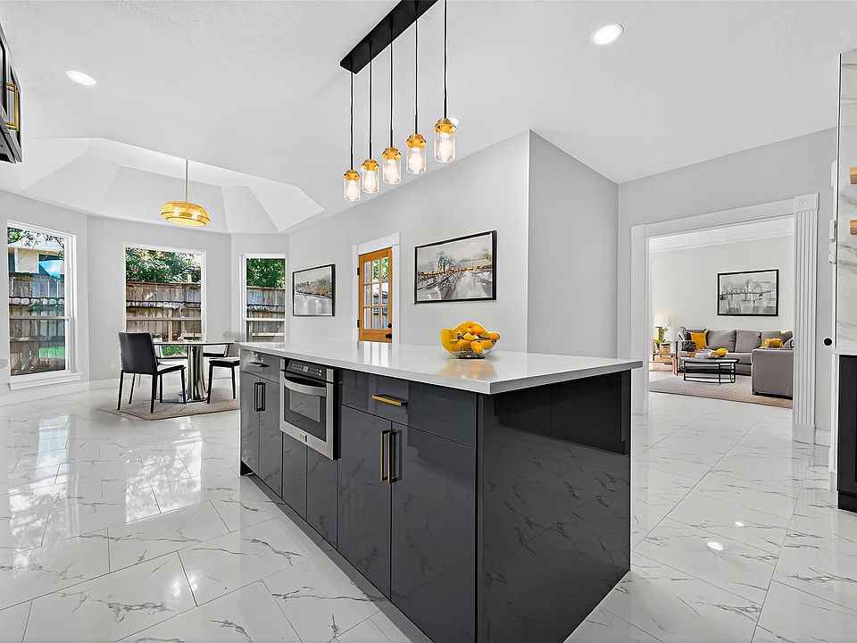 Cozy fireplaceModern dry barDesigner finishesRemodeled bathsCommercial style rangeGrand entryBeverage fridge