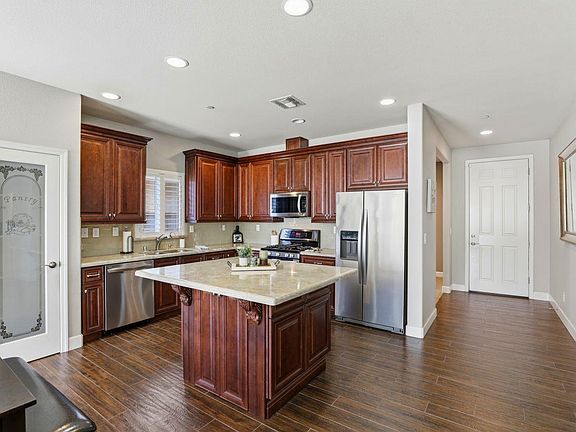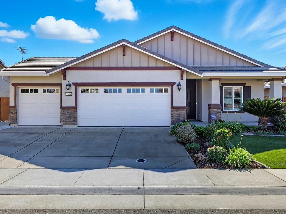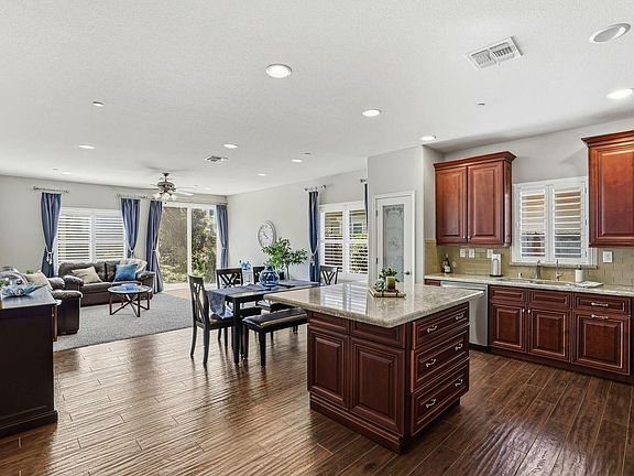 Beautifully upgraded single-story home featuring 3 bedrooms plus a den, 2 bathrooms, and a spacious 3-car garage. Approximately 1,500 sq. ft. of open living space with a seamless floor plan. The gourmet kitchen includes granite slab countertops, designer backsplash, upgraded cabinetry, pantry, and stainless steel appliances. Enjoy wood-style tile flooring in the kitchen and hallways, and plantation shutters throughout. The large living room opens to the backyard through a sliding glass door, perfect for indoor-outdoor living. The primary suite offers abundant natural light, a walk-in closet, and a stylish en-suite bathroom with a designer tile shower enclosure. Both bathrooms are tastefully upgraded. Spacious laundry room with lots of storage is conveniently located next to garage. Energy efficient tankless water heater. The oversized backyard is an entertainer's dream with a freestanding covered patio equipped with lighting and a ceiling fan. Drought-tolerant landscaping and a spacious side yard with a vibrant rose garden complete the outdoor space. This home combines comfort, style, and functionalityideal for modern living. Short walk to the popular 20 acre Oasis Park complete with dog park, walking paths, playgrounds, water play area & lighted pickleball, tennis, basketball!