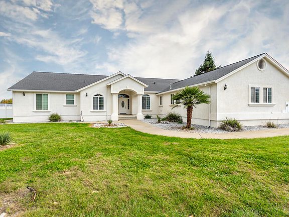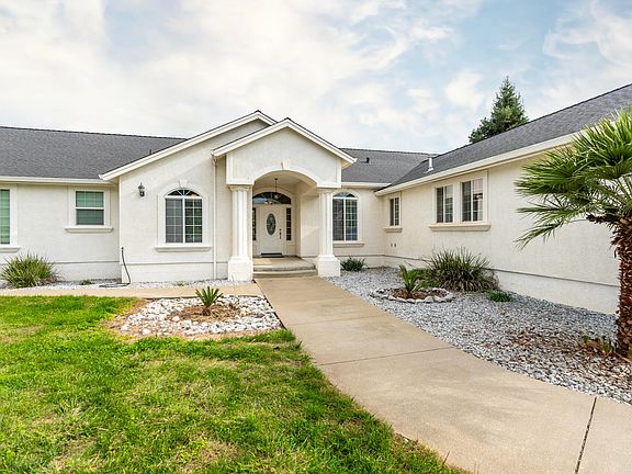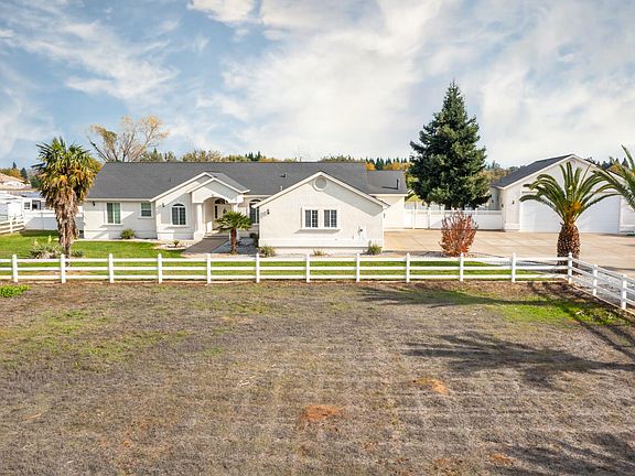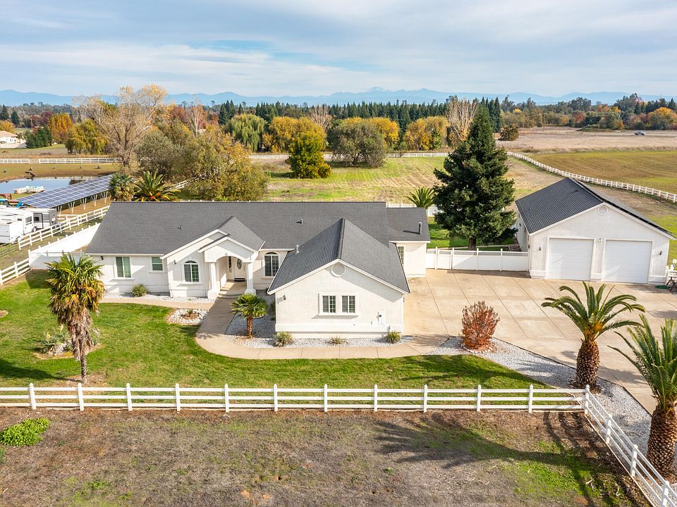 A masterpiece of country elegance, this luxurious 5-bd, 3-bath ranch style estate blends timeless craftsmanship with modern sophistication. Built in 2004, it showcases a chef's kitchen w/a 6 burner range, hood, granite slab counters, cherry wood cabinetry and large pantry. High ceilings, crown molding, and architecturally designed ceilings throughout. A spacious office, Dual HVAC units, central vacuum, and whole-house fan enhance everyday comfort. Enjoy potential zero electric costs with the 64 panel owned solar system. The peaceful, vinyl-fenced 5-acre property features cross-fencing for animals and a serene backyard retreat. The master suite offers a stunning star-design ceiling, romantic gas fireplace, jetted garden tub, walk-in closet, bidet and private porch access. An attached 2-car garage complements the impressive 2,100 sq. ft. finished RV Garage/shop w/ 1/2 Bath, 220, utility sink and 14' ceilings and 12' roll-up doors. With ACID water just beyond fence line at the rear and breathtaking views, this estate offers refined rural living just minutes from shopping, the airport, and freeway access.