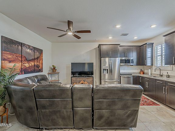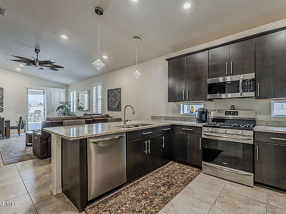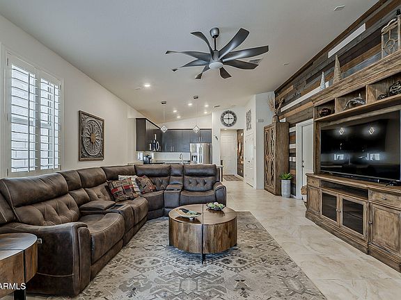 Welcome to this stunning multi-generational home located on a desirable corner lot with unobstructed views of the Superstition Mountains! Step inside to discover plantation shutters throughout, adding elegance and privacy to each room, as well as vaulted ceilings! The sharp looking modern kitchen boasts 42' espresso color cabinets, gas cook-top, stainless steel appliances, granite counters, large double door pantry with plenty of storage space. There is also a breakfast bar with stunning and unique pendant lights. The great room and dining area is wired for surround sound, as well as the multi-generation room! Beautiful variegated wood planks grace one side of the walls in the front hall, kitchen and great room which adds character. Tile floors throughout except for the bedrooms which have plush carpeting. This spacious residence features 3 well appointed bedrooms and 3 bathrooms with the primary bedroom having a walk-in shower, raised vanity with double sinks, walk-in closet and separate exit to the backyard. The secondary bedroom is up front. The spacious generation room has access from inside of the home and also a separate entrance for privacy, a living room and full kitchen area with stainless steel refrigerator, microwave, dishwasher, sink and an induction cooktop that sets on the countertop. It has a bedroom with closet and 3/4 bathroom with a walk-in shower. It also boasts a full-size stacked front load washer and dryer setup and pantry! This area makes it ideal for guests or extended family members to have their own private area! The layout is thoughtfully designed with privacy in mind! Welcome to your dream backyard with no homes directly behind and VIEWS of the Superstition Mountains. This is a low-maintenance retreat designed for relaxation and entertaining. Featuring a charming bar area, brick pavers, a stunning gas fireplace complemented by ample seating areas. The covered patio provides shade and comfort, while the lush artificial turf ensures a vibrant, green landscape year-round. And to top it off, there is a large Jacuzzi that accommodates up to seven people which is included in the sale! Making this outdoor oasis the ultimate destination for relaxation and enjoyment! THIS HOME IS A MUST SEE!!