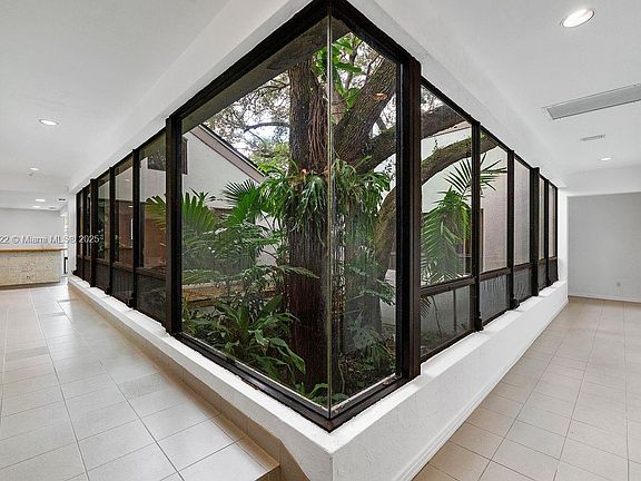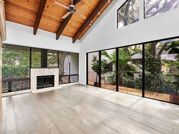 Mid-century modern 4BR/3BA + loft residence in Palmetto Bay, designed by architect Marc Firestone. Encompassing 4,362 total SF, this canal-front gem sits on a quiet cul-de-sac surrounded by majestic oaks and lush landscaping. The home embraces indoor-outdoor living with a central atrium. Vaulted wood-beamed ceilings, walls of glass, and natural light define the open spaces. A spiral staircase leads to a loft overlooking the family room with fireplace and bar. The kitchen opens to a covered screened terrace and patio with heated pool ideal for entertaining. Features include new plank flooring, 2024 metal roof, ample parking, and a private concrete boat launch.
