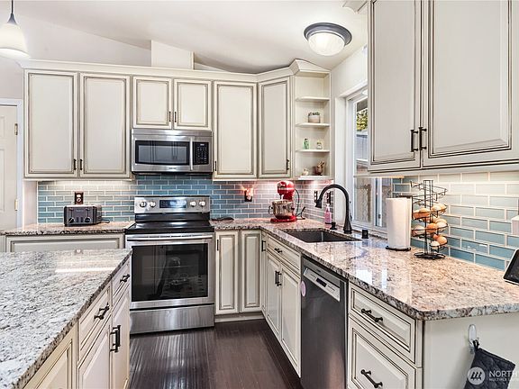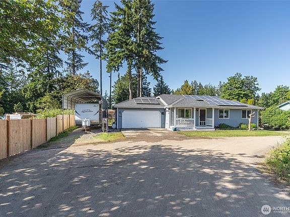 Nicely updated 1 level Home with Covered Front Porch on .38acres. Private Quiet Location off the main road is Fully Fenced with plenty of room for a Boat, RV or Extra Vehicles. Sliding doors from Primary and Kitchen lead out to the patio and Fully Fenced backyard with Gardens, Fruit Trees, Dog run, Chicken Coop, Shed, Green House, Firepit & 2 Car 400 sq ft Shop Building w/220 amp. This home has savings throughout: Solar Panels, Tankless Water Heater, Propane Free Standing Stove. Ceiling Fans in every room for the most comfortable Economic living! Beautifully updated Kitchen Cabinets, Tile & Light Granite Counters w/Extra-Lg Island. Dark Rich Bamboo floors in the main and Kitchen. Located close to Bremerton and Silverdale & All Amenities!