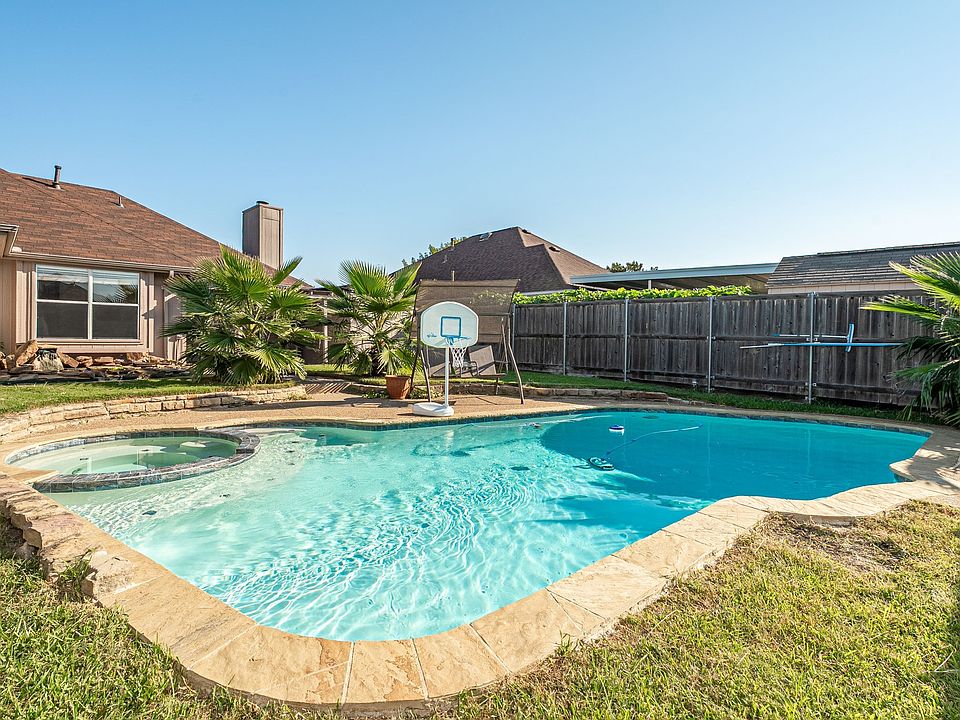 Relax and unwind in the private Primary Suite. The Ensuite Bath offers luxury with Dual Sinks and a coveted Jetted Tub. The resort lifestyle awaits you outside! The private, fenced backyard features a pool complete with an attached, in-ground hot tub and a patio area—perfect for entertaining. Enjoy peace of mind with a 2-car attached garage, central heating and cooling, and location within the desirable Garland ISD. This home offers great location with close proximity to schools, shopping and 190 HWY. Don't miss this opportunity for a beautifully updated home with a gorgeous backyard!