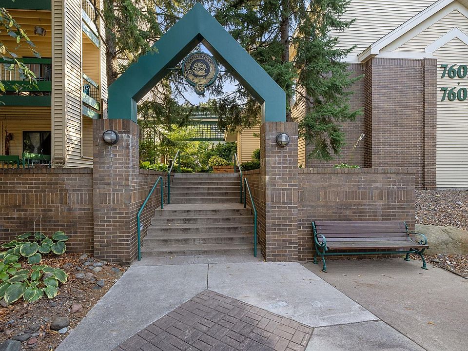 Rare, renovated two-level penthouse unit in the heart of the Edinborough Park Neighborhood of Edina, steps to Edinborough Park & Fitness Center, Centennial Lakes Park & Recreation Area, YMCA Southdale, and many great restaurants and retail. Main level features remodeled kitchen with stylish quartz counter, new appliances and new floors, with a breakfast bar open to spacious, two story vaulted living room with gas fireplace and courtyard-facing balcony/deck, and dining room. Staircase leads to Primary Suite with full bath, walk-in closet, and in-unit laundry. Feels like a luxurious hotel suite! All new flooring, lighting, paint, and kitchen/bath renovations. 2 heated, underground garage stalls #715 and #716 with huge storage lockers mounted above, plus stalls are the closest spots to the garage entry/staircase! Superb association, with HOA dues including membership to Edinborough Park, with fitness center, indoor track, indoor heated pool, play area, and park. Don't miss this unit!