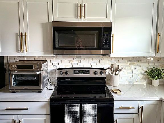 Quartz countertopsMassive master closetNew landscapingTall ceilingsAmple storageOpen floor conceptStainless steel appliances