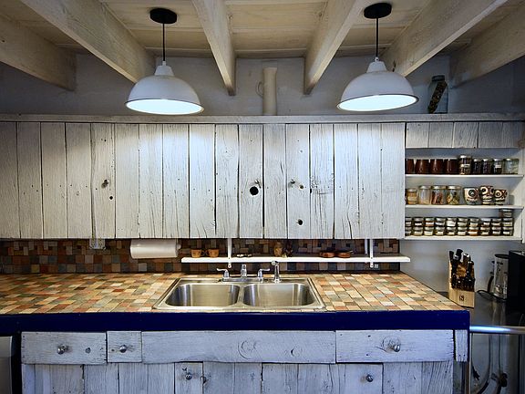 Interior Features: Classic brick floors, beamed ceilings, and a kitchen with unique reclaimed barn wood cabinets.