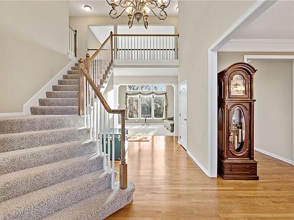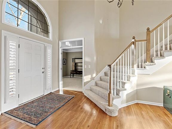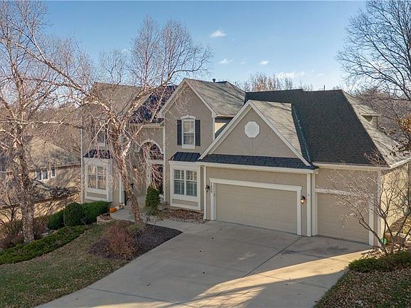 Step into this stunning residence, meticulously maintained and brimming with remarkable features. The open floor plan, vaulted ceilings, and expansive windows offering views of the serene, tree-filled backyard create a light, airy atmosphere throughout. You’ll immediately feel at home in the spacious interior. At the heart of the home is the inviting kitchen hearth room, featuring beautiful wood floors, a large kitchen island, and a cozy fireplace flanked by built-in bookshelves. Perfect for relaxing mornings or entertaining, the newer, no-maintenance deck extends the living space outdoors. You’ll enjoy peace of mind with recent upgrades, including a newer roof, HVAC system, and water softener. The main level also features a convenient laundry room with built-ins and a sink, as well as a luxurious primary suite with two large walk-in closets, a fireplace, and a whirlpool tub. Upstairs, you’ll find 4 expansive bedrooms with ample closet space and attached bathrooms, all connected by a charming catwalk overlooking the great room. The great room itself is a showstopper, with a stunning fireplace, floor-to-ceiling windows, remote control blinds, and professionally tinted glass. Plantation shutters and wood blinds add an elegant touch throughout. The custom finished walk-out basement is designed for both relaxation and entertainment. It includes a large rec room, media room, bar area and a game area with built-in benches. There’s also a versatile room that could serve as a guest bedroom, office, or craft room. Additional storage space is available with a workbench and built-in shelves. This home is ideally located with easy access to highways and just minutes from the vibrant Lenexa City Center, offering a variety of shopping, dining, and entertainment options. The neighborhood is surrounded by parks and walking trails, making it an ideal setting for your new home.