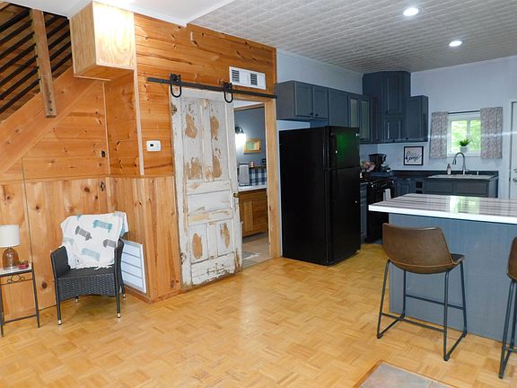 - Description: Wood laminate flooring, cedar on walls, tin on ceiling, ceiling fan, gas fireplace