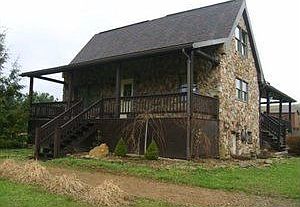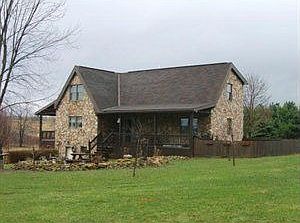 This very unique log home with a stone exterior is located in a quiet country setting is truly a must see. It has two covered porches on the the front and side of the home,Pellet stove on the main level living room, electric fireplace in the family room. All appliances included.