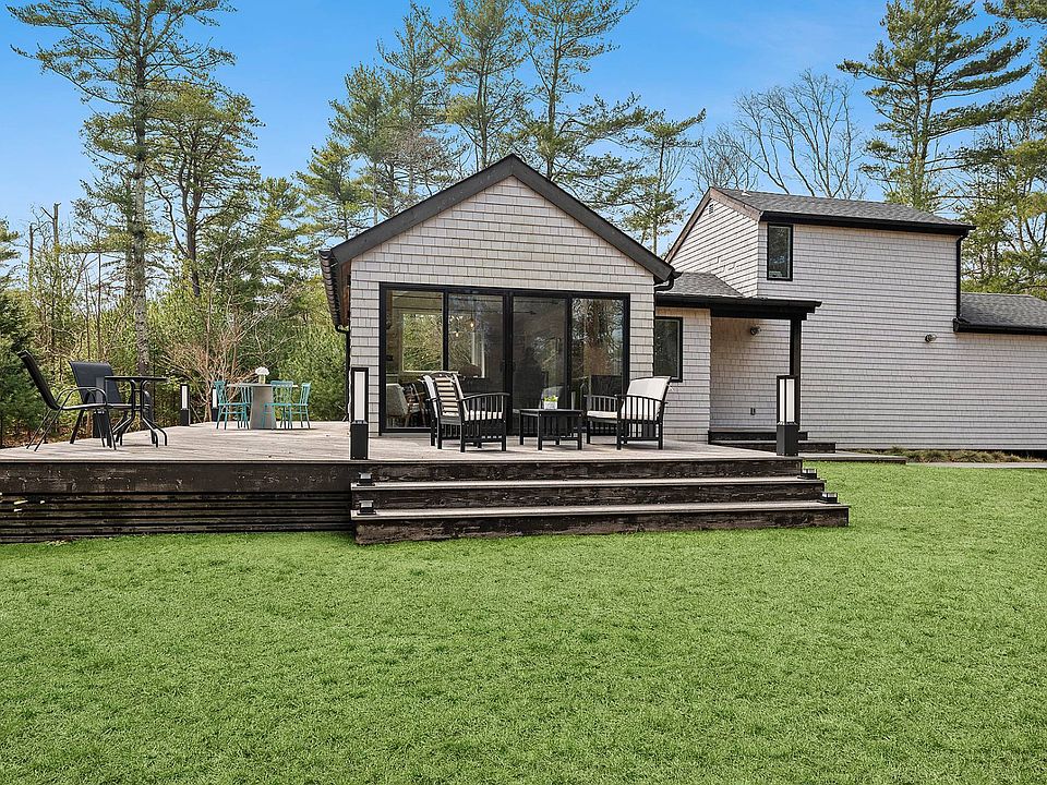 acres of preservation with hiking trails and easy access to Sag Harbor Golf Course. The main level of this chic Hamptons home features an open concept floor plan including an eat-in kitchen with large center island, a spacious dining area, a seating area with sliding doors leading out to the back deck, and the livingroom with a windowed wall inviting in the natural light. Also on the main level are two bedrooms and a full bath with bathtub. The second floor offers the third en-suite bedroom. The wrap around mahogany decking with multiple seating and dining areas and the spacious, manicured lawn offer great outdoor entertaining spaces. This is the perfect place to spend your summer in the Hamptons!