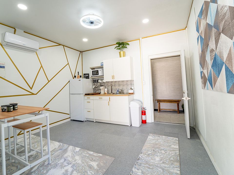 DOWNSTAIRS-The downstairs is the kitchen area, which also has room to put a couch in to make it more of a social area. There is a full bathroom downstairs as well.