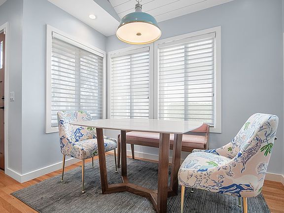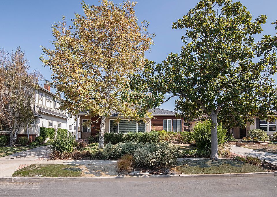Framed by mature maple and magnolia trees in the front and a koi pond in the back, this prime North Kentwood three-bedroom ranch home offers contemporary comfort and luxurious living. Drought-resistant landscaping, gated red-brick trimmed driveway, and shaded sidewalks soften this home's exterior while the shiplap-style vaulted ceilings with walnut beams sharpen the interior. Meticulously renovated to maximize the spacious open floor plan, the living space glimmers with hardwood floors, recessed lighting, and expansive picture windows while offering a classic stacked-stone dual-sided fireplace. The premiere entertainer's kitchen features Thermador and Bosch appliances, a six-burner range with mounted hood, large eat-at island with pendant lighting, and adjacent breakfast nook, all illuminated by myriad windows and automated skylights. The seamless flow from the kitchen to the dining area is marked by geometric lines yet softened by an intuitive use of space, including a built-in buffet hutch and the gentle dance of sky blue accents against crisp white wood. An inviting primary suite offers dual closets and sliding doors to a private sitting deck overlooking the grassy backyard oasis with koi pond. The exquisitely renovated ensuite bathroom shines with dual marble vanities, an oversized walk-in shower, and separate soaking tub with frosted glass window for just the right amount of sunlight. Two ample-sized secondary bedrooms and bathrooms are located down the hall to provide ample privacy. A detached finished garage makes the perfect bonus space for a home office, gym, or rec room. Wonderfully located on one of Silicon Beach's most coveted streets, this home is waiting to envelop you with character, luxury, and SoCal magic.