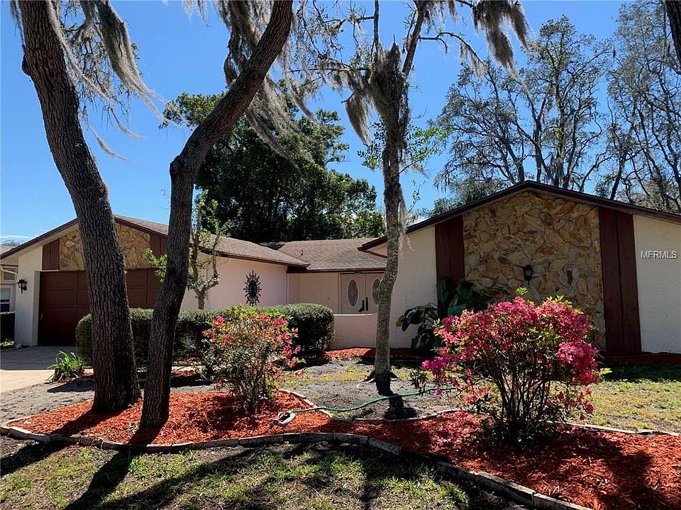 Welcome home to this adorable and spacious 2 BR, 2 bath house with an attached 2 car garage and almost 1600 SF of living space! Surrounded by beautiful tropical landscaping, this property features a freshly painted exterior and interior, upgraded light fixtures, NEW bathroom sinks, NEW gutters, and NEW mulch. NEW Flat roof has been recently installed. Master bedroom has large walk-in closet with master bath attached with dual sinks and tub/shower. Enjoy your morning coffee in the nicely sized screened-in lanai. Nice sized lot with plenty of room for a pool or room addition for 3rd bedroom. Indoor utility room. Conveniently located to restaurants, shopping and Beaches, golf courses and much more! Schedule your showing today. Optional HOA of $50 per year.