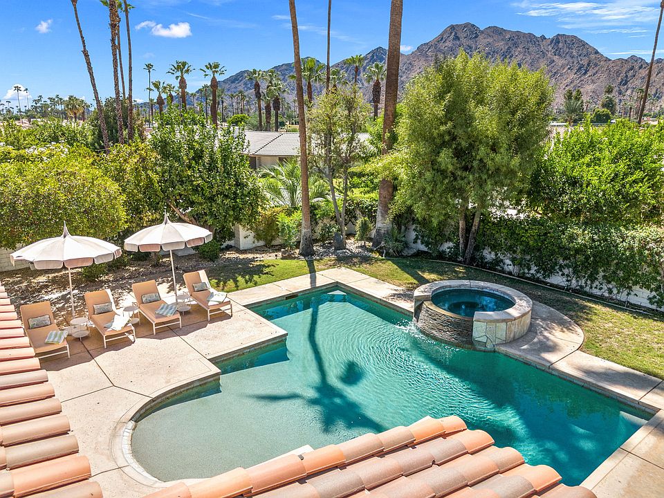 Tucked within one of Indian Wells' most sought-after enclaves, this updated desert residence pairs generous scale with an effortless, modern sensibility. South facing orientation captures unobstructed views of Mount Eisenhower and the surrounding ranges, while the .28 acre corner lot provides both privacy and a sense of openness rarely found in the area. Inside, vaulted ceilings and a soft, natural light define the home's atmosphere, creating spaces that feel airy, calm, and inviting. Travertine floors extend throughout the main living areas, grounding the interior in warm, organic texture. The great room centers on a monumental stone fireplace an architectural gesture that brings presence and balance to the open layout. Adjacent dining and entertaining zones include a dedicated wet bar, while the expansive kitchen offers a central island, counter seating, and a breakfast room overlooking the pool terrace. The primary suite occupies its own wing, offering a spacious retreat with vaulted ceilings, an oversized walk-in closet, dual vanities, and a separate tub and shower. Two additional guest suites each with a private bath provide comfort and separation for family or visitors. A fourth bedroom, also suited as an office or den, enjoys its own private patio, adding flexibility for work, reading, or quiet retreat. An oversized laundry room doubling as a butler's pantry enhances the home's functionality and storage. Outdoors, the south-facing pool and spa serve as the focal point of the property, featuring a beach entry, baja shelf, and waterfall spa. Multiple lounging and dining areas are wrapped by mature landscaping and citrus trees, creating a relaxed, resort-like environment with dramatic mountain backdrops throughout the day. Additional features include newly painted interior and exterior, a finished two car garage with epoxy floors, double door foyer entry, and a thoughtful layout that promotes connection, light, and livability. The home provides a seamless transition into the Indian Wells lifestyle just moments from world class golf, luxury resorts, and the shopping and dining experiences of nearby El Paseo.