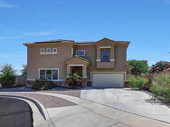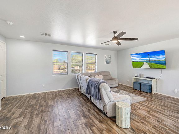 Move-in ready 2-story home featuring a low-maintenance front yard, cozy front porch, and 2-car garage. Bright open floor plan with neutral tones and wood-look flooring throughout the main level. The kitchen offers upgraded wood cabinetry with crown molding, stainless steel appliances, granite countertops, recessed lighting, a pantry, and a center island with breakfast bar. Upstairs, the oversized primary suite includes clerestory windows, plush carpet, dual sinks, and a large walk-in closet. Spacious backyard is perfect for entertaining with a large paver patio, artificial turf, sparkling pool, and relaxing spa.